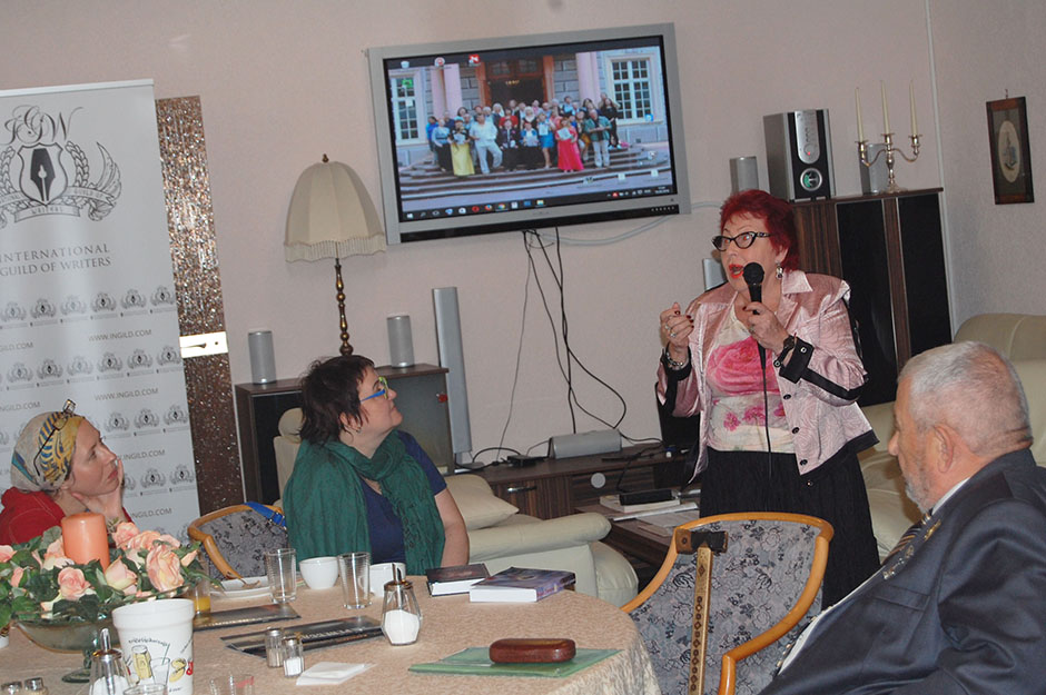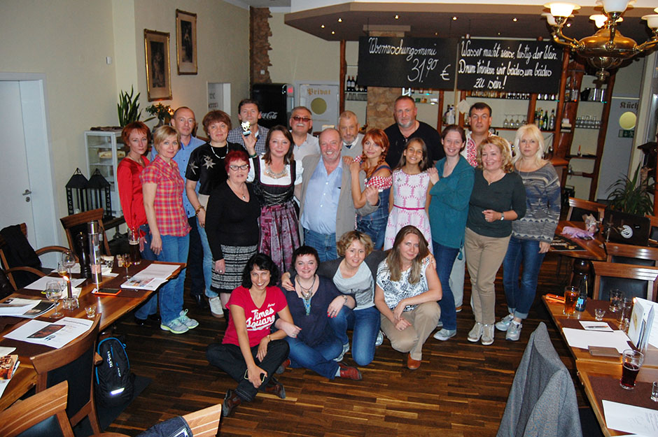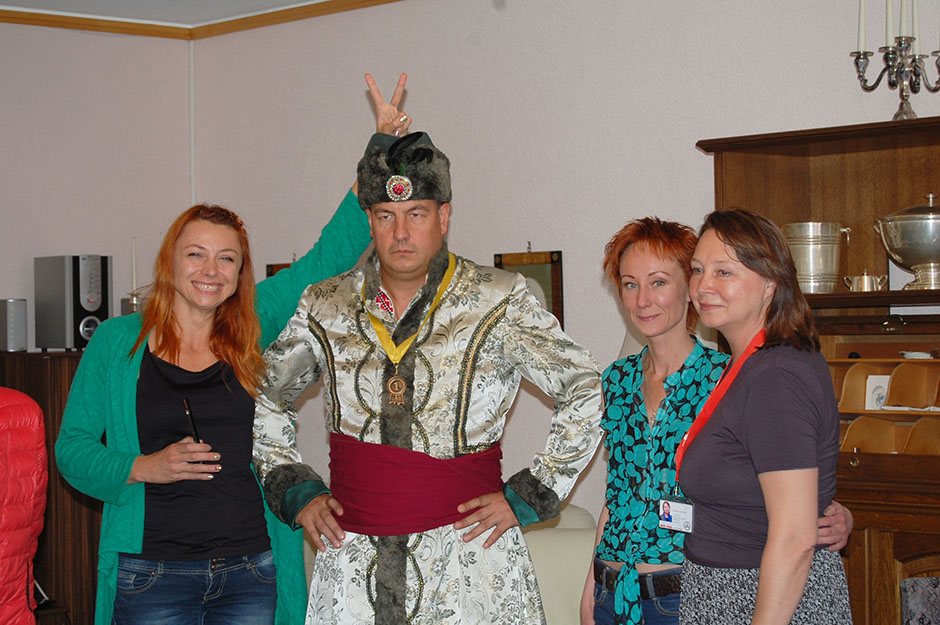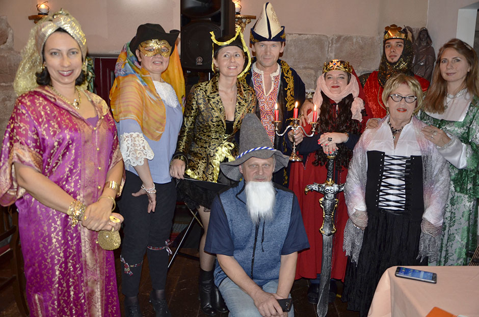 После официальной части мы перенеслись в необыкновенный мир карнавала, устроив самый настоящий маскарад в средневековом стиле. Вот тут наши гости проявили не дюжую смекалку и фантазию, представив своих героев в самых разных жанрах: от пантомимы до драмы, песен и танцев, декламации и интерактива. Правду говорят, если люди талантливы, то талантливы во многом, что с успехом в этот вечер доказали наши писатели. Искусству их перевоплощения можно было только позавидовать. Не остались в стороне даже скептики, очень скромные сами по себе персоны и те, кто ни слова не понимал по-русски. Заговорили!!! А это значит, что не только мы учим немецкий язык, но и русский, благодаря нам, вливается в здешнюю жизнь.